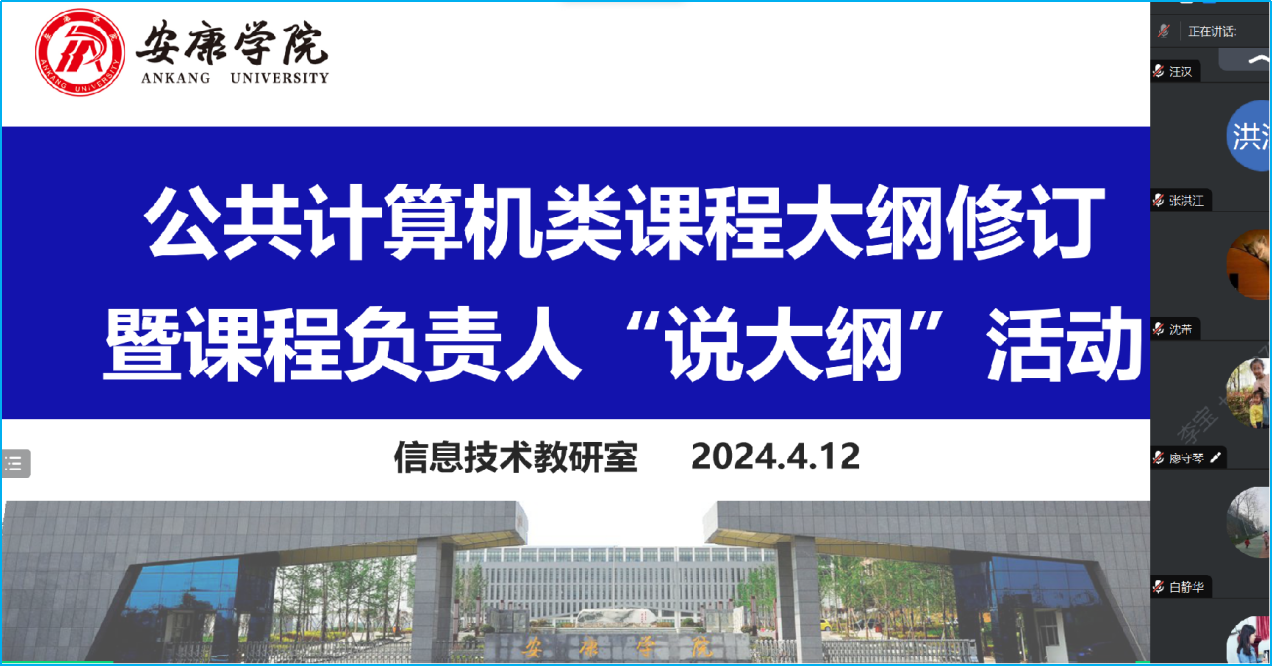 为迎接学校本科教育教学审核评估工作,深化课程改革,提高公共计算机类课程任课教师的教学水平和能力,结合学校要求及学院实际情况,信息技术教研室于2024年4月12日开展“公共计算机类课程教学大纲的修订暨课程负责人说大纲”的教研活动。此次活动采用腾讯会议线上形式举行,活动由李宝主持,买球体育官方网站教学副院长宋权华、信息技术教研室全体教师参加了本次活动。