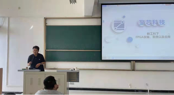 雷斌首先非常赞同将FPGA开发板发放给学生,此项活动不仅提高学生实践动手能力,而且为学生在新工科背景下较好的就业打下了坚实的基础。随后从行业发展史介绍了2015年英特尔以167亿美元收购FPGA第二大厂商Altera公司、2020年美国AMD公司以350亿美元收购FPGA芯片龙头赛灵思公司的事件,并且对FPGA的背景和应用进行了介绍,突出FPGA的未来发展方向以及在新工科背景下FPGA技术行业的需求和就业情况,并对其进行了系统的分析。随着新型基础设施的发展,FPGA技术与5G技术、人工智能和数据高速处理紧密结合,将会使社会生活发生巨大进步,作为相关专业的大学生就业前景良好。讲座结束后,雷斌经理和师生进行了深入交流,回答了许多FPGA的就业和技术问题。