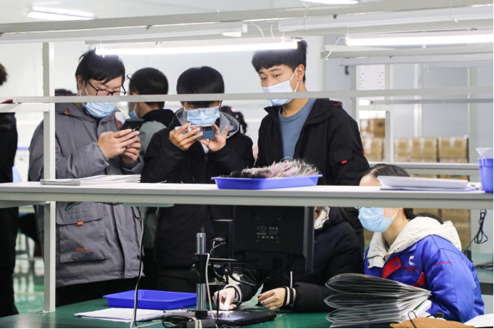 接着,在公司生产负责人的带领下,同学们参观了智能无线耳机、智能音响、智能移动电源等产品的生产一线。