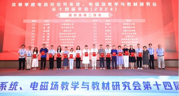 2024年8月2日,第六届全国高等学校青年教师电路、信号与系统、电磁场课程教学竞赛全国总决赛在内蒙古农业大学举行,本次比赛初赛阶段经过六个分赛区进行选拔,国防科技大学、哈尔滨工业大学、电子科技大学、西北工业大学等高校教师进入决赛,其中60名教师进行现场展示、41名教师进行视频展示,我校教师朱燕在西北赛区选拔中获得一等奖,进入视频展示环节,由马西奎教授、罗先觉教授、陈后金教授等知名专家担任评委,在决赛中朱燕老师荣获信号与系统组二等奖。