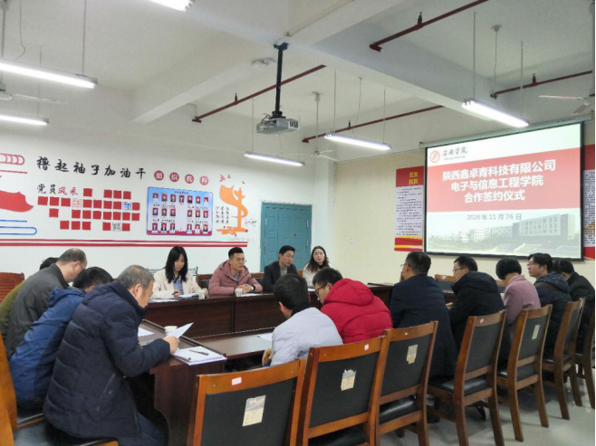 2020年11月26日下午,买球体育官方网站与陕西鑫卓青科技有限公司就合作事宜进行座谈,并举行合作签约仪式。院长陈守满、副院长王克刚、办公室主任、系(教研室、中心)主任、电子信息工程系和物联网工程系的全体教师出席了座谈会。
