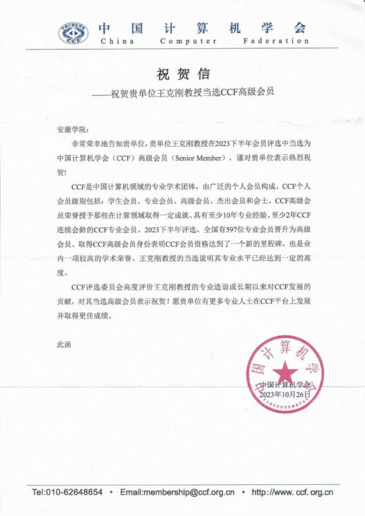 近日,中国计算机学会(CCF)向我校发来贺信,祝贺我校买球体育官方网站王克刚教授当选CCF高级会员,同时欢迎我校有更多计算机专业人士在CCF平台上发展,并取得优异的成绩。