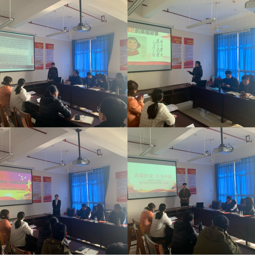 初审会上,教工第一、二支部的教师与学生第一、二支部的学生依次以现场讲党课的方式进行授课。教工第一支部教师王幸幸党课题目为《论共产党员的修养》,通过重温经典著作,讲述中共党员为什么要修养、在哪些方面进行修养、怎样修养,深刻感悟学为人师,行为世范,在科研创新中勇攀高峰,当好学生引路人。教工第二支部教师余顺园以《学党史故事立德,铭使命担当树人》为题,带领大家学习刘胡兰的英雄故事,讲述“生的伟大,死的光荣”,用生命书写坚定和忠诚的一生。学生第一支部学生赵梦党课题目为《不忘初心跟党走,争做优秀新青年》,以陈独秀的故事让大家铭记探寻救国之路做出卓越贡献的有为青年们,更激励当代青年把自身发展和祖国前途命运相结合。学生第二支部学生马文瑞以《清澈的爱,只为中国》为题讲述“零零后”卫国戍边战士陈祥榕捍卫边疆,英勇献身的感人事迹,并号召同“零零后”的当代大学生要坚定信念,心向党,情弥坚,听党话,跟党走,创佳绩,攀高峰。