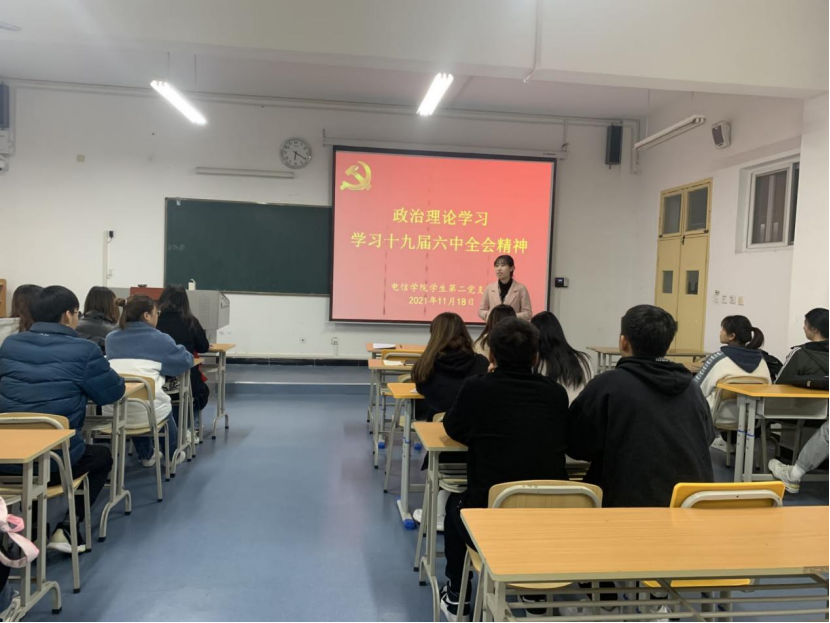2021年11月18日下午,买球体育官方网站学生第二党支部在江北校区1321教室开展主题党日活动,就《习近平总书记在庆祝中国共产党成立一百周年大会上的讲话》和《中国共产党第十九届中央委员会第六次全体会议公报》进行专题学习,学生第二党支部支委、全体在校党员及发展对象参加了此次会议,会议由学生第二党支部书记李章雨主持。