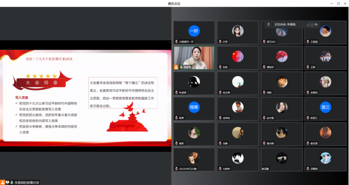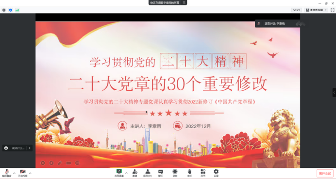 为深入学习贯彻党的二十大精神,深刻领会、准确把握党的二十大精神实质和丰富内涵,切实引导党员把思想、认识和行动统一到学习、宣传、贯彻党的二十大精神上来,2022年12月27日,买球体育官方网站学生第二党支部书记李章雨以围绕学习宣传贯彻党的二十大精神,从二十大主题、社会变革、历史地位、时代要求等方面对党的二十大重要内容进行了详细解读,结合自身学习体会和工作实际,深入浅出地为全体党员上了一堂生动的专题党课,推动党的二十大精神学深悟透、落到实处。