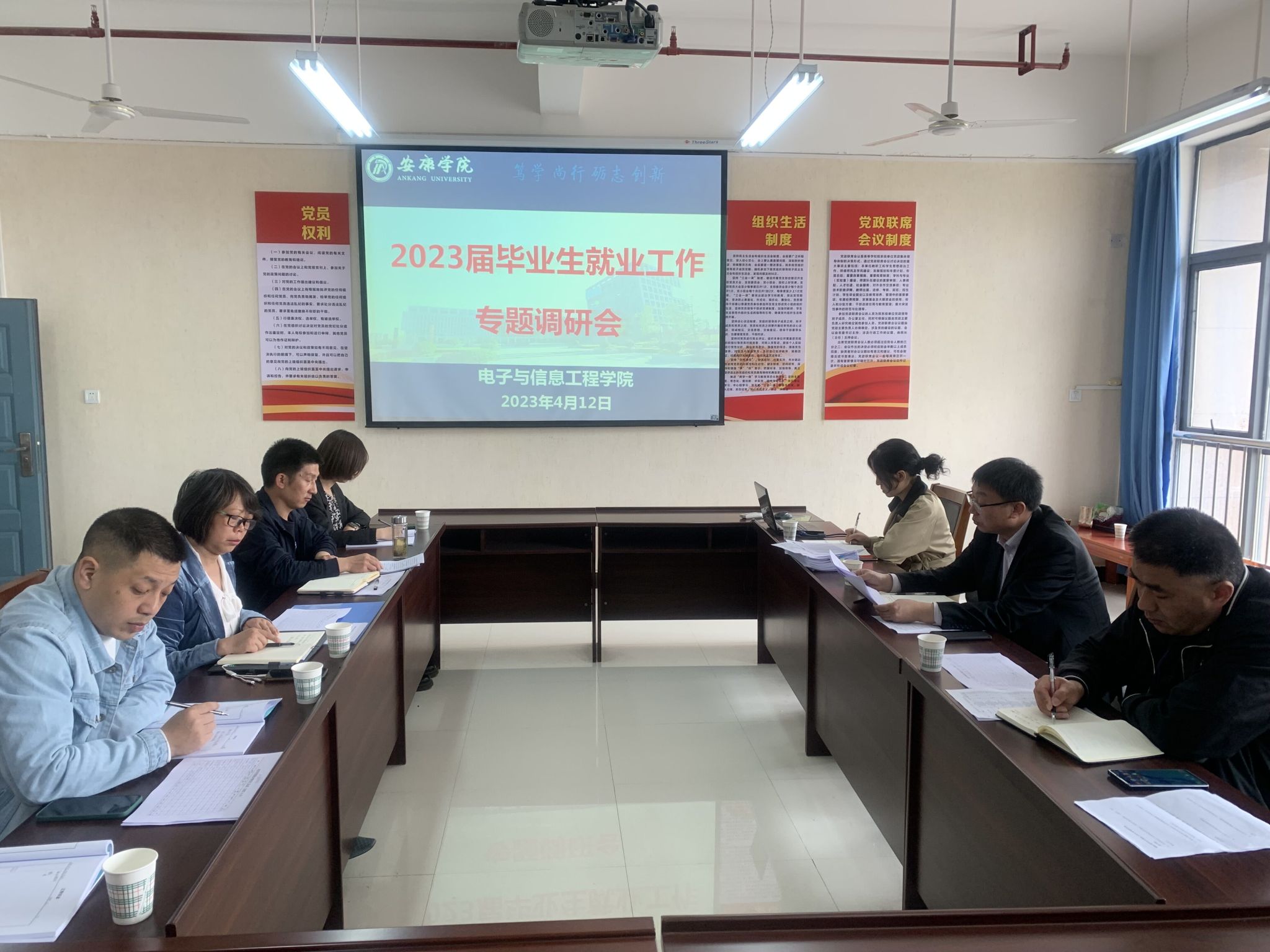 为进一步做好2023届毕业生就业工作,促进毕业生更充分、更高质量就业,贯彻落实国家、陕西省和买球体育官方网站有关加强高校毕业生就业工作的文件精神,4月13日上午,党委委员、副校长张东红,招就处副处长程国栋,校友科科长张远秀莅临买球体育官方网站调研2023届毕业生就业工作。买球体育官方网站党总支书记于咏梅、党总支副书记蔡正旺、学工办主任石纭昊以及毕业班辅导员李章雨、吕以宁参加会议。会议由于咏梅主持。