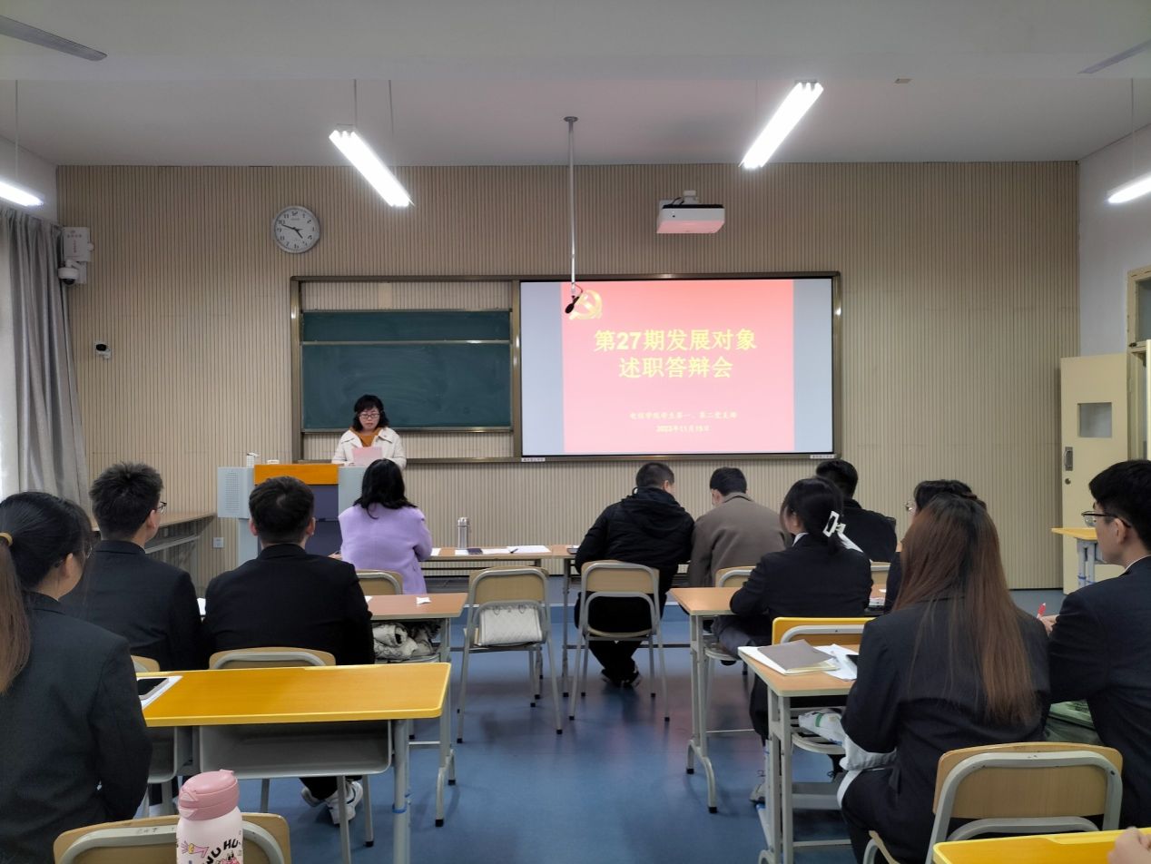20231115日下午,买球体育官方网站党总支在一号楼1321教室召开发展对象述职答辩会。党总支组织委员成英丽、学生第二党支部书记李章雨、组织(纪检)委员石纭昊,学生第一党支部组织(纪检)委员张宇航、辅导员翟子轩以及学院全体第27期发展对象参加答辩会。会议由学生第二党支部党员邓宣宣主持。