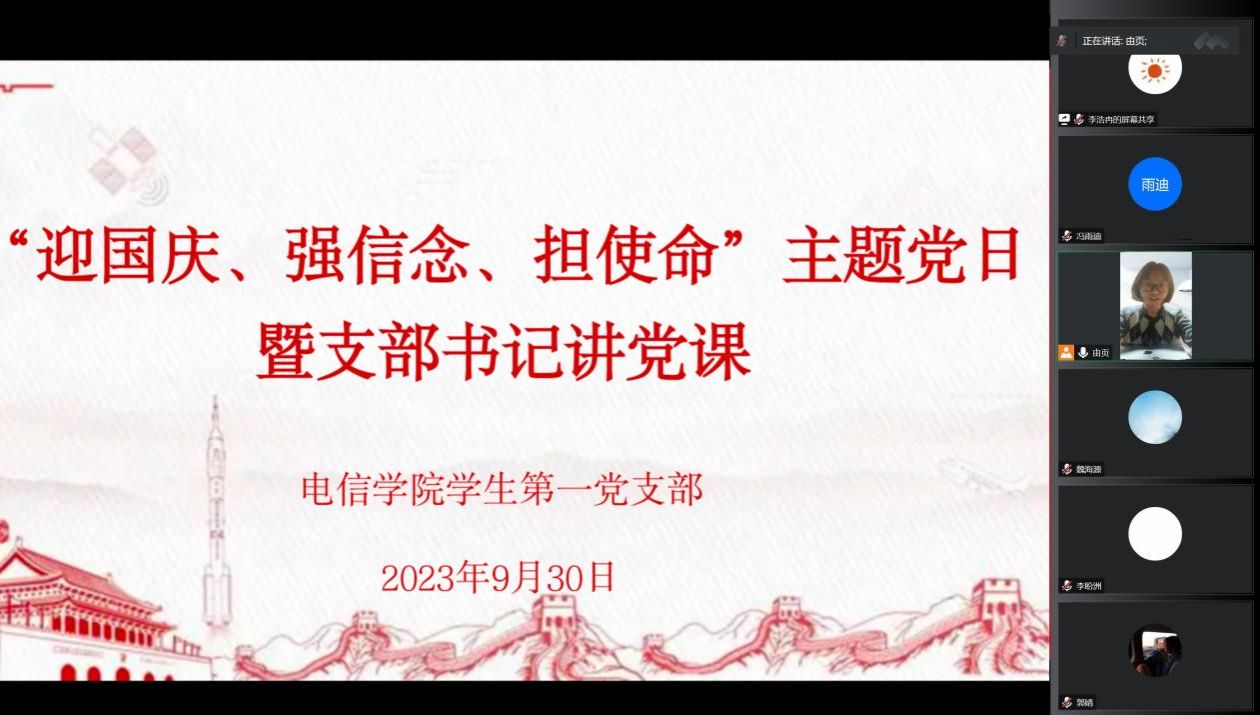 为庆祝中华人民共和国成立74周年,激励支部党员听党话、感恩党,跟党走,增强支部成员的凝聚力、战斗力和号召力,2023年9月30日下午19:30,买球体育官方网站学生第一党支部通过线上腾讯会议,开展“迎国庆、强信念、担使命”主题党日暨支部书记讲党课。本次活动由学生第一党支部书记吕以宁主持,学生第一党支部全体党员参加。
