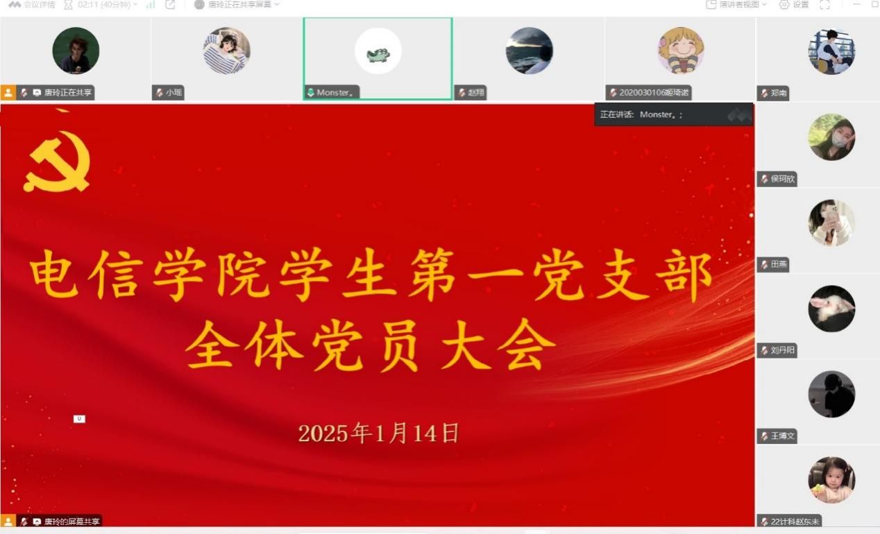 为深入学习贯彻党的二十届三中全会精神和全国教育大会精神,坚定不移推进全面从严治党向纵深发展,增强党员的纪律意识,根据中共买球体育官方网站委员会《关于召开2024年度组织生活会和开展民主评议党员工作的通知》的相关要求,买球体育官方网站学生第一党支部于1月14日通过线上的形式召开党员大会开展2024年度组织生活会暨民主评议工作。会议由党支部书记翟子轩主持,全体党员参与。