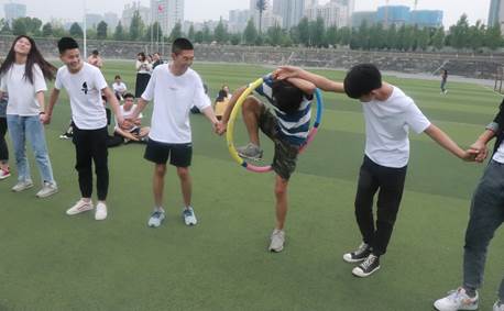 首先进行的是“穿越呼啦圈穿越”项目,同学们手拉手让呼啦圈在团队中传递,彼此间互帮互助、配合默契,以最快完成呼啦圈传递的团队为胜利。此次趣味运动会包含有四个项目,旨在培养同学们的团队精神,让大家通过活动调整心态,缓解学习带来的压力。