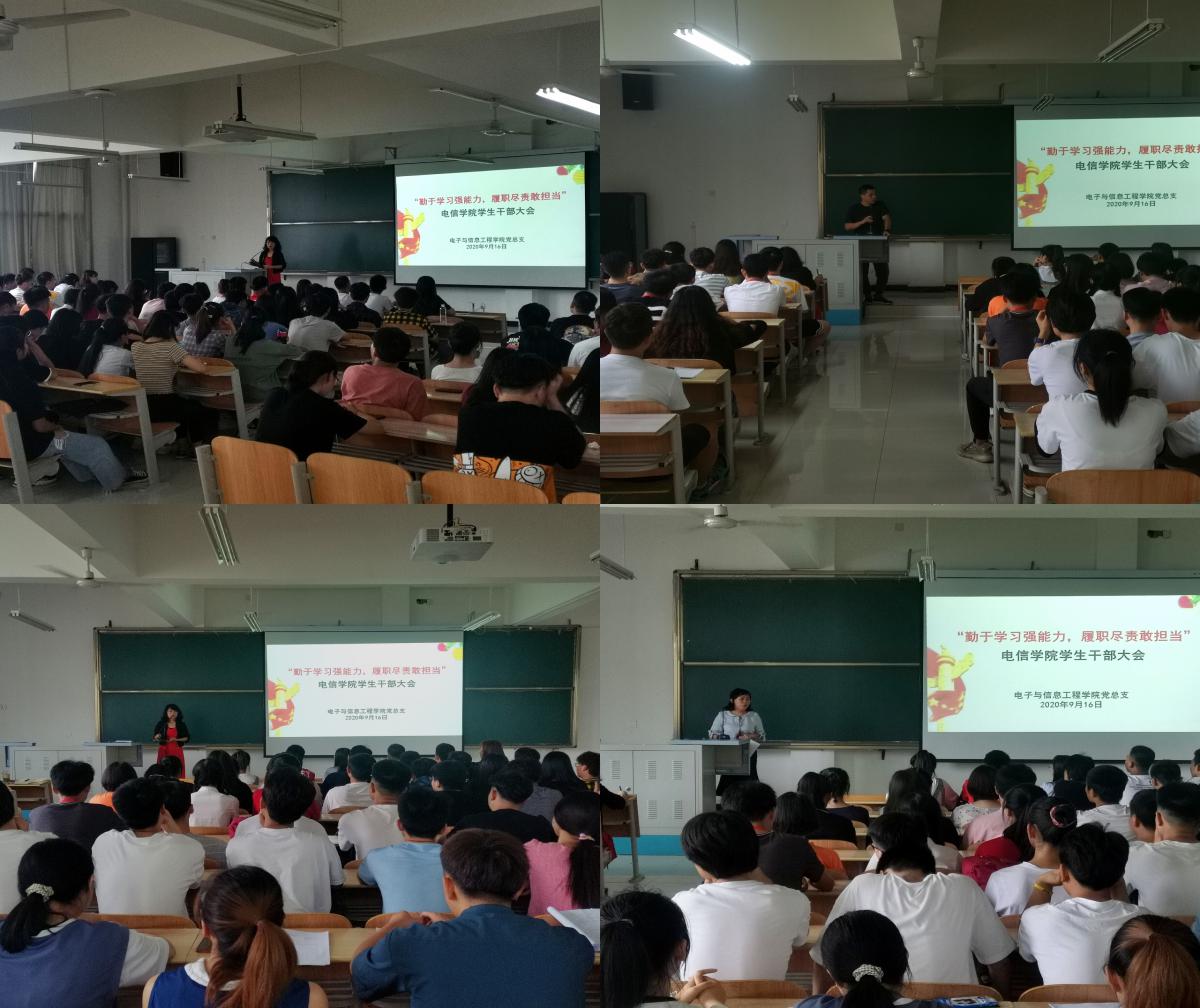 2020年9月16日,买球体育官方网站召开“勤于学习强能力,履职尽责敢担当”为主题的学生干部大会。买球体育官方网站团总支、学生会部长以上干部、各班级主要学生干部参加会议,党总支书记于咏梅、学工办主任石纭昊、学生党支部书记成英丽、团总支书记李章雨、辅导员程晓梅老师出席了会议,会议由学工办主任石纭昊老师主持。