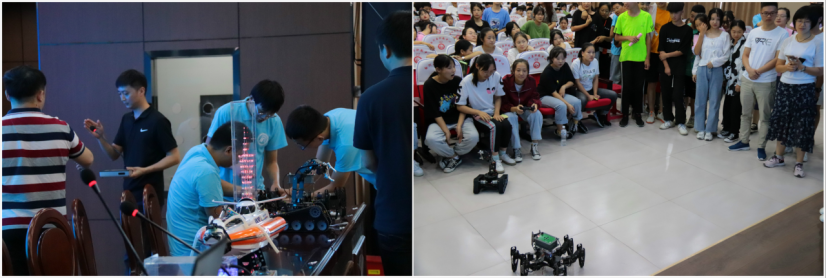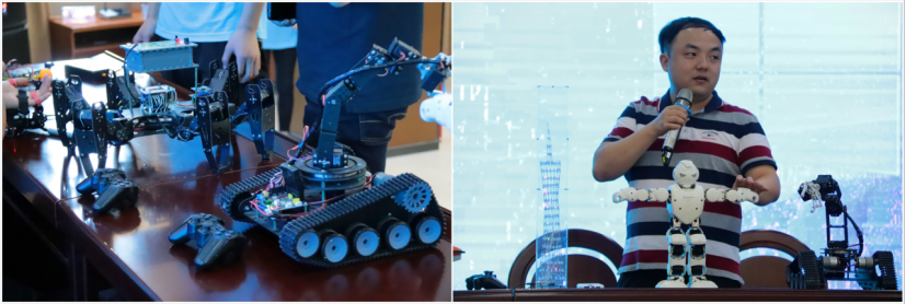 随后,ICT创新学院的学生团队带来了科技创新作品实物展,邹圣雷作为指导老师分别从作品的应用场景、设计思路和技术实现过程等方面逐一介绍了舞蹈机器人、手语翻译手套、便携式移动在线水质检测系统、履带式机械臂、六足仿真机器人等科技作品。在科技作品的介绍中,邹老师穿插引入“中美贸易战”中两国在科学技术实力方面的差距,勉励在座的同学们,努力学好专业知识,提高职业技术素养,为中国科技强国战略贡献自己的力量。之后,同学们观看了带来的科技作品演示,同学们兴趣浓厚,热情参与。