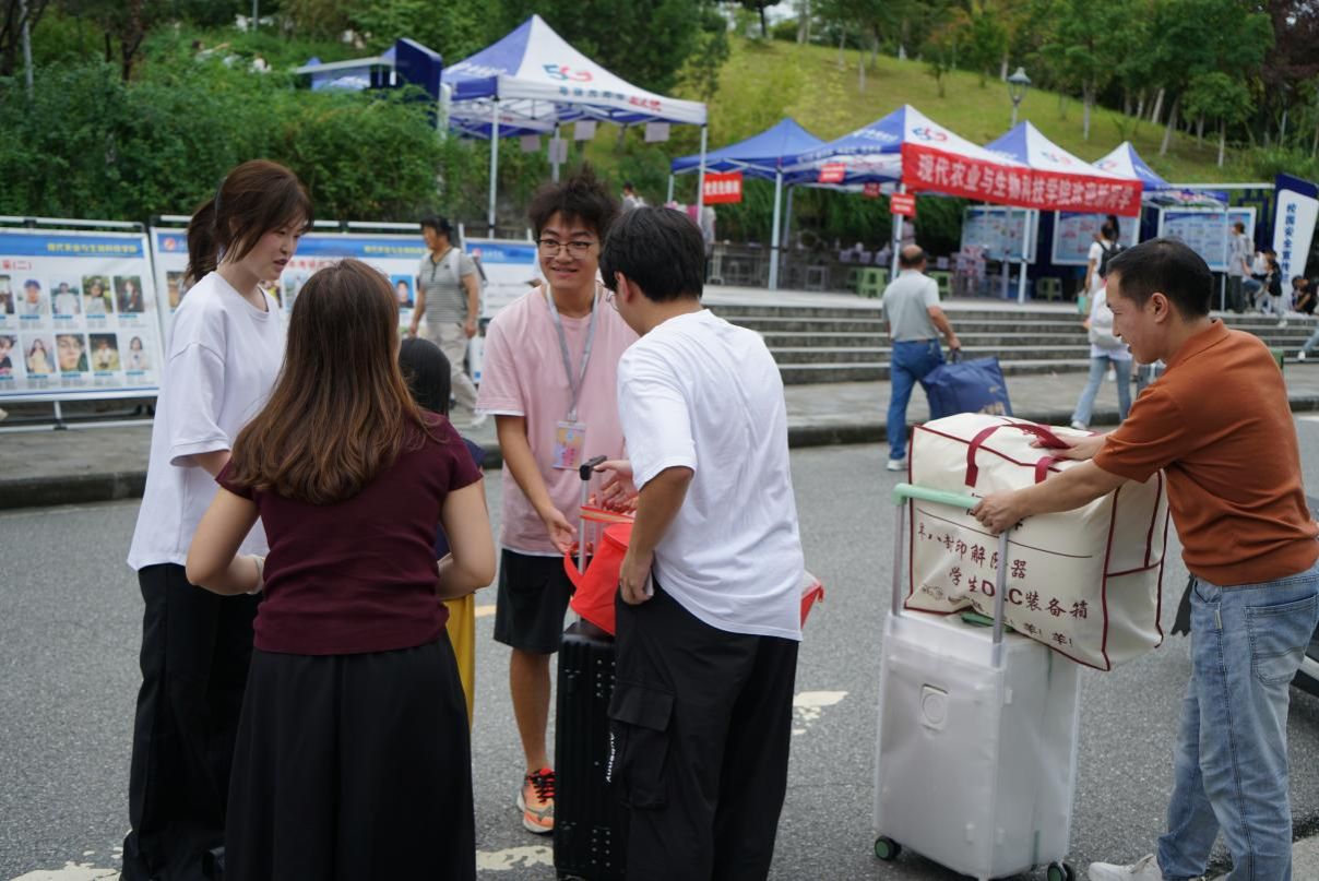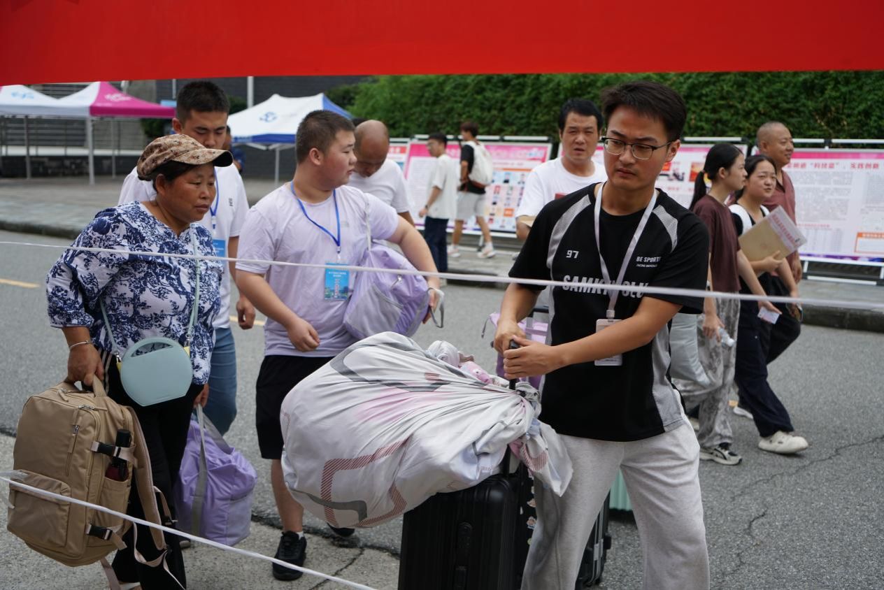 迎新现场,高年级迎新服务队的学生们成为校园里温暖的风景线,他们主动上前迎接新生与家长,耐心引导完成报到注册、校园卡办理、住宿信息确认等手续;遇到携带大件行李的家庭,第一时间伸手帮忙,将行李运送至宿舍;针对新生对校园环境不熟悉的情况,他们带领新生熟悉教学楼、食堂等场所,用热情与细致让新生快速感受校园温暖。