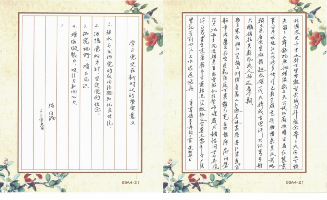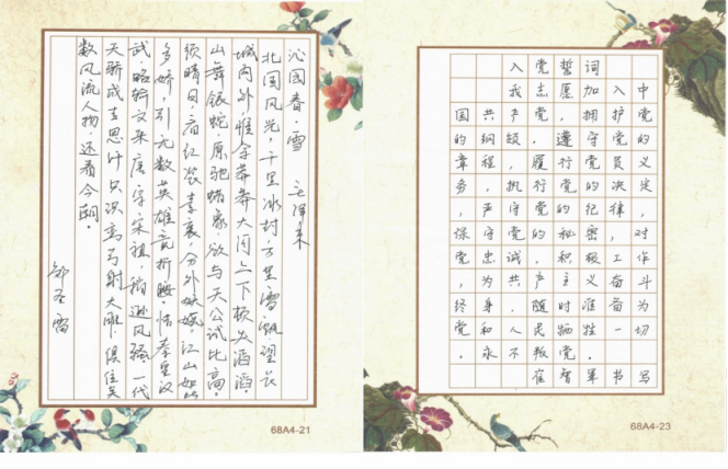 在第二阶段的“学党史硬笔书法展示”活动中,学院体教职工学习党史、手抄党史,积极展示教学基本功。在书写现场,老师们屏息凝神、运笔流畅,把对党的热爱和学习党史的热情融入到一笔一顿中,作品或刚劲有力,或潇洒飘逸,或大方得体,或秀气隽美,展现出买球体育官方网站教师扎实的教学基本功和昂扬向上的精神状态。