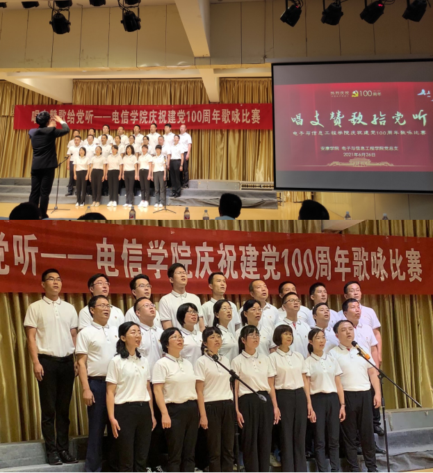 在第一阶段的“唱支赞歌给党听”活动中,首先由学院全体党员合唱《我宣誓》,全体教职工分组合唱了歌典《歌唱祖国》、《中国中国,鲜红的太阳永不落》、《没有共产党就没有新中国》。