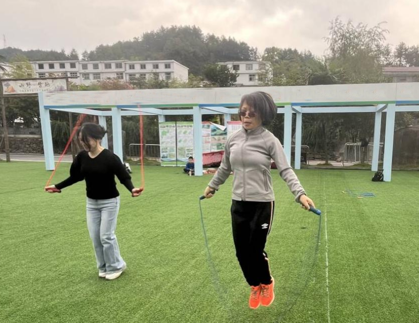 接下来是跳绳比赛。随着口令声的响起,绳子在空中飞速旋转,教师们齐心协力,步伐一致,尽显体育精神。比赛中,有几位教师的幽默表现引得现场阵阵欢笑,活跃了气氛,释放了情绪,亲近了自然。