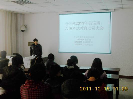 为严肃国家英语四六级考风考纪,电信系于2011年12月16日分专业召开了英语四六级考试考生考前诚信教育动员大会。