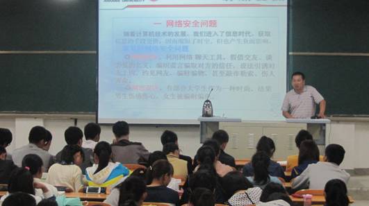 为帮助2013级新生更好的适应大学生活,提高学生安全防范意识,10月14日晚,电子与信息工程系在1301室开展“新生入学教育之安全教育篇”,保卫处张峰老师应邀到场为电信系278名新生带来了一场精彩的安全教育讲座。