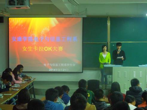3月21日晚,由电信系主办的《女生卡拉OK大赛》在2102教室如期举行。比赛前期,系学生分会在全系进行了为期两天的宣传,并最终吸引了来自我系不同专业不同年级的60余位音乐爱好者报名参加,这次大赛的评委是由学生分会的46名学生干部组成的大众评审。