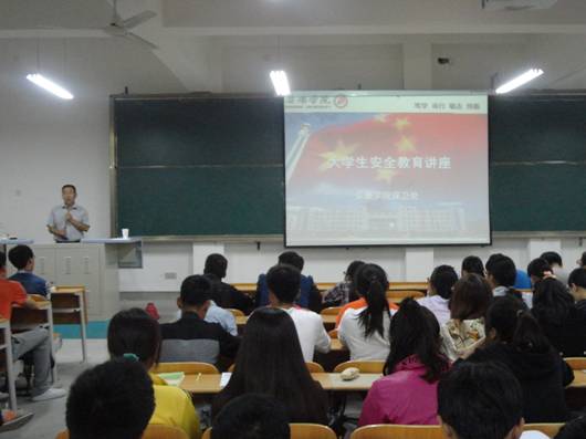 9月15日晚,电信系在1301室开展新生入学教育,由学院保卫处副处长王开忠为新生做安全讲座。