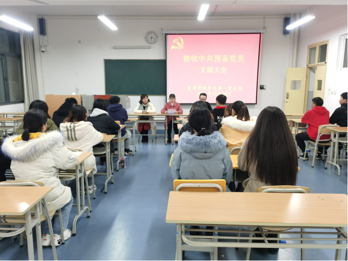 2021年12月28日下午,买球体育官方网站学生第一党支部在1320教室召开党员大会,接收中共预备党员研究讨论于昊等9位同志加入中国共产党事宜。买球体育官方网站学生第一党支部书记程晓梅,党总支组织委员成英丽,支部组织(纪检)委员张宇航,宣传(统战)委员王心悦,支部全体在校学生党员和本期发展对象参加了本次会议。会议由程晓梅主持。
