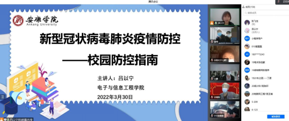 根据《陕西高校新型冠状病毒肺炎疫情防控工作指南》和买球体育官方网站相关疫情防控规定,3月30日买球体育官方网站通过腾讯会议举办了“疫情防控校园指南”主题讲座。本次讲座由买球体育官方网站辅导员吕以宁针对校园日常防控工作、疫情应急处置工作、学生健康管理工作等内容为学生进行讲解。买球体育官方网站全体在校生参加此次讲座。