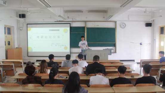 分享会开始,白佳乐同学以自己的考研经历为基础,从考研初心、院校选择、备考规划、心态调整四个方面给备考同学提出了一些建议。他讲到:“考研应该是发自内心的,而不是从众心理所导致的”,并且告诉同学们不论在考研的哪一个阶段,都应有自己的主见,不随波逐流,这样才能大大提高考研的成功率,并以“时间从来不语,却能给你所有问题的答案”这句话预祝备考学生都能成功上岸。
