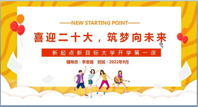在喜迎党的二十大召开之际,为顺利做好新学期线上教学的各项准备工作,促进学生与老师之间的有效沟通,加强学生思想政治教育和疫情防控常态下的线上教学,辅导员李章雨组织所带的学生召开了“喜迎二十大,奋进新征程”开学第一课主题班会。