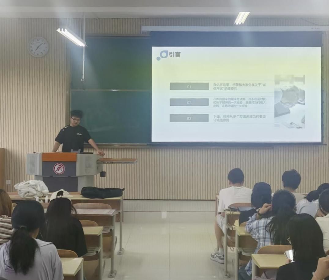 随后,会议围绕“为何坚守诚信原则”展开多维度阐述,提醒同学们以诚信应考,树立积极向上、公平竞争的优良学风。在“如何做到诚信考试”方面,负责人从思想与行动两方面提出具体要求:思想上,鼓励同学们树立正确的价值观,认识到考试是检验学习成果的途径而非目的,通过踏实学习、认真备考来展现真实水平;行动上,提醒同学们考前合理规划时间、充分复习,熟悉考试规则,考试过程中严格遵守考场纪律,杜绝携带违规物品、交头接耳等作弊行为。此外,学院倡导同学们相互监督,共同维护考试秩序。