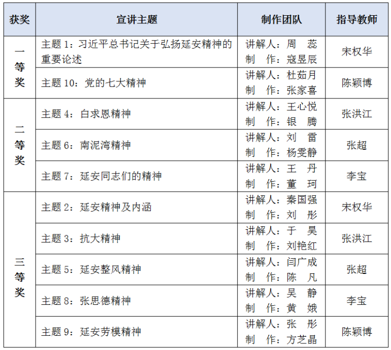 本次活动中学院总支精心策划、专业教师认真指导、学生党员和青年学生积极参与,认真撰写讲稿,精心拍摄视频,共制作出10期宣讲微视频经评审小组评定,党总支委员会审定,评选出一、二、三等奖,其中一等奖2名,二等奖3名,三等奖5名,并给予奖励。
