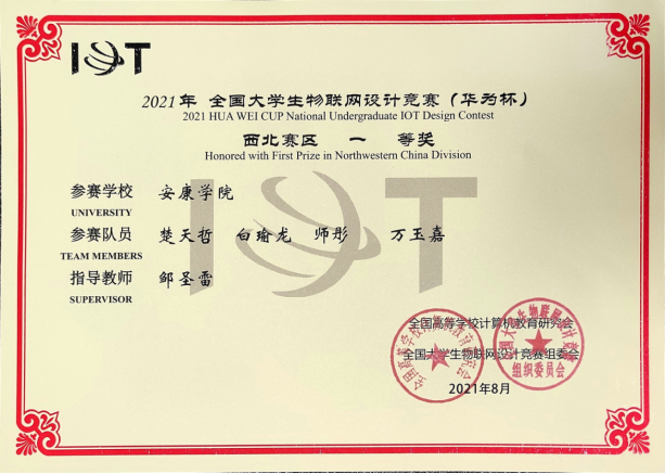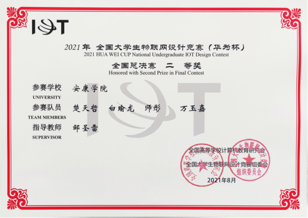 近日,2021年全国大学生物联网设计竞赛(华为杯)全国总决赛在上海紫竹科学园隆重举行。买球体育官方网站邹圣雷老师指导的学生团队(楚天哲、白瑜龙、师彤、万玉嘉)表现出色,在西北赛区获一等奖入围全国总决赛,最终荣获全国二等奖。