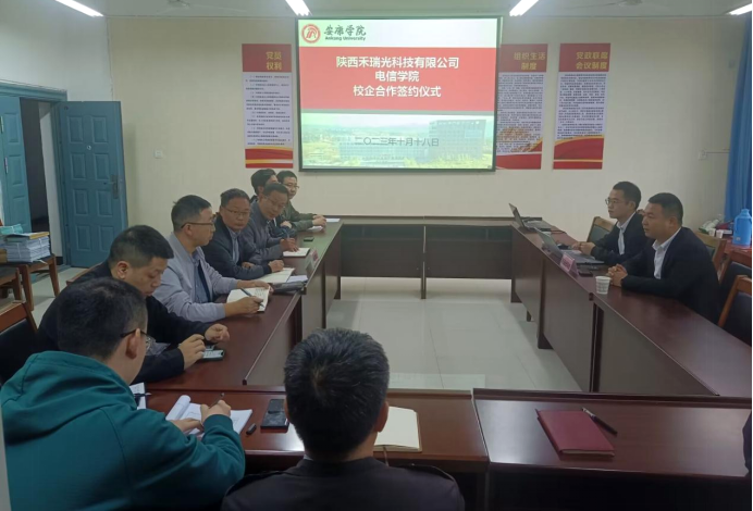 10月18日下午,买球体育官方网站在科技楼B702与陕西禾瑞光科技有限公司签署了校企合作协议。陕西禾瑞光科技有限公司总经理高亚明、行政主管赵行平,学院院长陈守满、副院长王克刚、两办主任及各系主任参加了签约仪式。签约仪式由学院副院长宋权华院长主持。