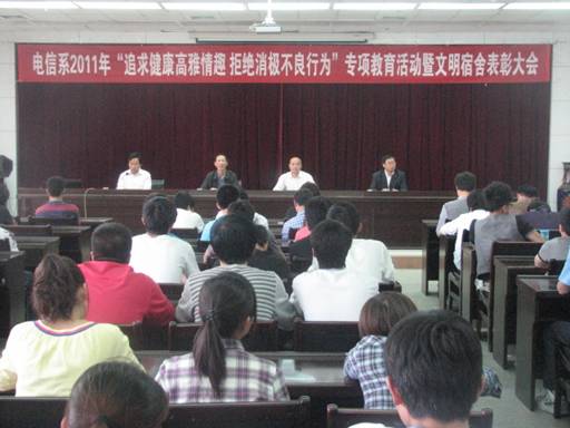 4月18日,电子与信息工程系在图书馆六楼报告厅举行2011年“追求健康高雅情趣,拒绝消极不良行为”专项教育活动暨文明宿舍表彰大会。学生工作部部长郑树青、系党总支书记李红兵、系副主任陈守满、学工办副主任石纭昊、辅导员成英丽和2010级学生参加了会议。大会由系主任钟生海主持。