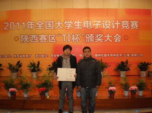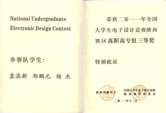 日前,从全国大学生电子设计大赛组委会传来喜讯,在2011年全国大学生电子设计大赛陕西赛区中,电子专业09学生袁新浪、郑鹏元、杨杰获得三等奖。