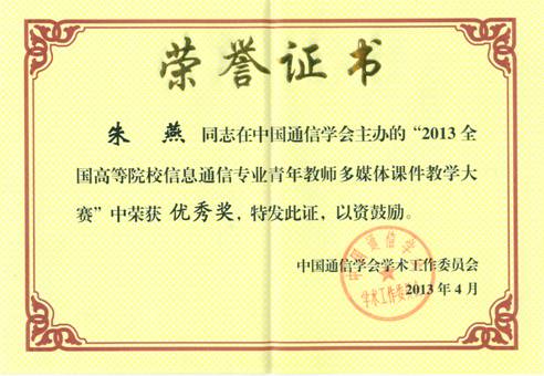 参会期间,教师朱燕参加了“2013全国高等院校信息通信专业青年教师多媒体课件教学大赛”,并获得优秀奖。