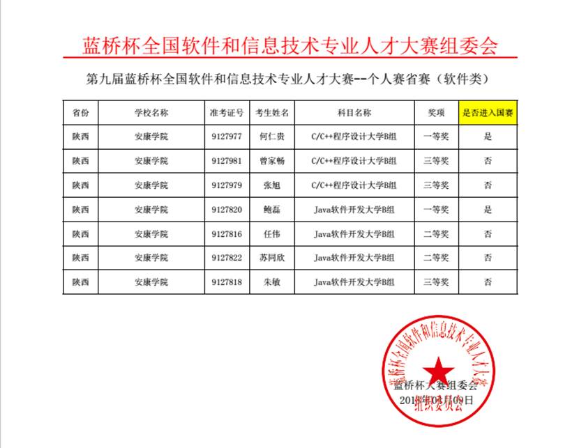 第九届“蓝桥杯”全国软件和信息技术专业人才大赛初赛成绩今日揭晓,我校学生获C程序设计大学B组一等奖1名,三等奖2名,获JAVA程序设计大学B组一等奖1名,二等奖2名,三等奖1名。何仁贵、鲍磊两位同学将代表学校参加5月底在北京举行的第九届蓝桥杯全国总决赛。