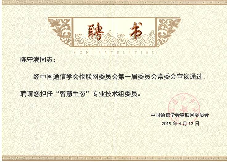 本次会议还宣布成立了中国通信学会物联网委员会“智慧生态”专业技术组,买球体育官方网站院长陈守满教授被聘为专家委员。