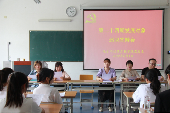为深入贯彻落实党的十九大精神和习近平新时代中国特色社会主义思想,把好党员“发展关”,切实提升党员发展质量,结合支部党员发展工作需要,6月1日下午,买球体育官方网站学生第一、第二党支部在江北校区1319教室开展了2022年上半年发展对象述职答辩会,买球体育官方网站党总支书记于咏梅,党总支组织委员成英丽,学生第一党支部书记程晓梅、组织(纪检)委员张宇航,学生第二党支部书记李章雨、组织(纪检)委员石纭昊、辅导员吕以宁以及19名第24期发展对象参加答辩会。会议由学生第二党支部书记李章雨主持。
