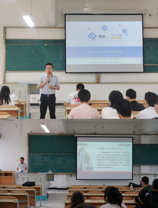 接着各个企业进行培训、就业宣讲。西安达内集团宣讲人李军峰通过PPT展示了公司的基本情况、未来发展方向、招聘需求,宣讲了达内集团的企业优势;粤嵌科技集团宣讲人高博龙围绕公司的企业简介、行业发展前景、集团主营业务以及集团研发产品进行介绍,并回答了“学习是为了什么”以及“计算机、电子信息类专业毕业后有哪些选择”的问题,他向大家强调:“趁着决定权还在自己手中的时候及早做出决定,不然时间会替你做出抉择,那不会是你想要的结局”;北京千锋集团宣讲人石振龙用视频展示了往届买球体育官方网站优秀毕业生在千峰集团的工作分享,介绍了千锋教育优秀的师资团队,石振龙根据买球体育官方网站各专业的特点,推荐了千峰集团不同的就业岗位,让在座的学生对于IT行业的职业有了新的认识;北京华清远见集团宣讲人张治西给大家介绍了集团自主研发能力、培训经验、集团项目情况,宣讲了选择华清远见集团的优势以及参加集团实训预期效果。中公教育晁凯向同学们介绍了中公教育的集团规模以及陕西总部情况,宣讲中公教育的企业理念、企业文化、核心产业以及公司所需人才类型。会后,各个企业对同学们的诸多疑问进行解答。