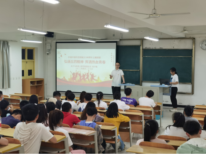 坚持党建带团建 为激发买球体育官方网站广大团员青年爱党、爱国情怀,实现党建带团建的目标,培养电信学子践行社会主义核心价值观,以昂扬的斗志和精神状态庆祝建团百年,迎接党的二十大胜利召开,4月28日,买球体育官方网站党总支书记于咏梅在1307教室以“重温党团历史,汇聚强大力量”为主题,为电信学子上了一堂生动的主题“党课+团课”。