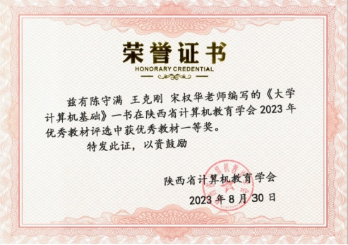 近日,2023 年陕西省计算机教育学会优秀教材揭晓,由我院陈守满、王克刚、宋权华主编、北京邮电大学出版社出版发行的《大学计算机基础(Windows 10+WPS版)》荣获一等奖。