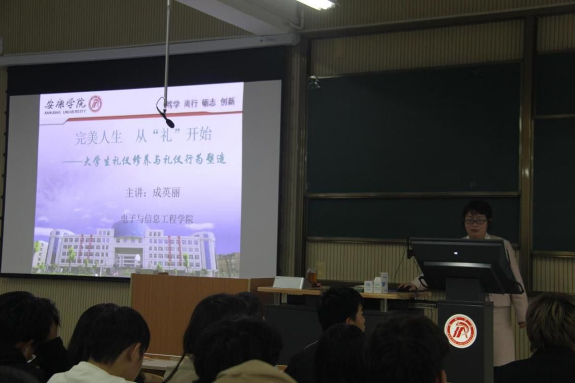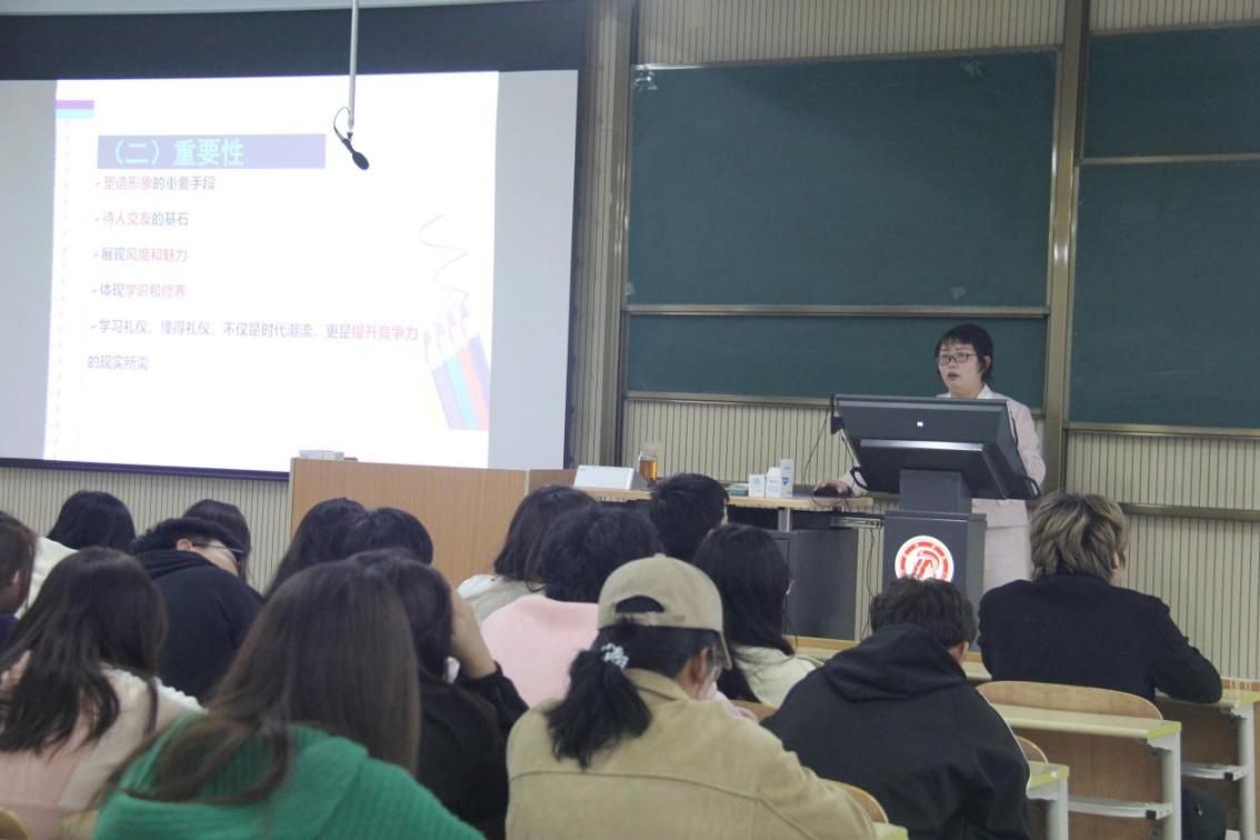 讲座之初,成英丽以校园文明礼仪方面的不良现象为切入点,就礼仪的含义、重要性展开讲述。她从学校生活礼仪、服饰礼仪、仪表礼仪、仪态礼仪、交往礼仪等方面为同学们详细地介绍了校园文明礼仪的注意事项。她讲到:文明礼仪可以帮助同学们与他人建立良好的人际关系,促进大学生身心健康,增强大学生人文素养,提高大学生的思想道德素质。