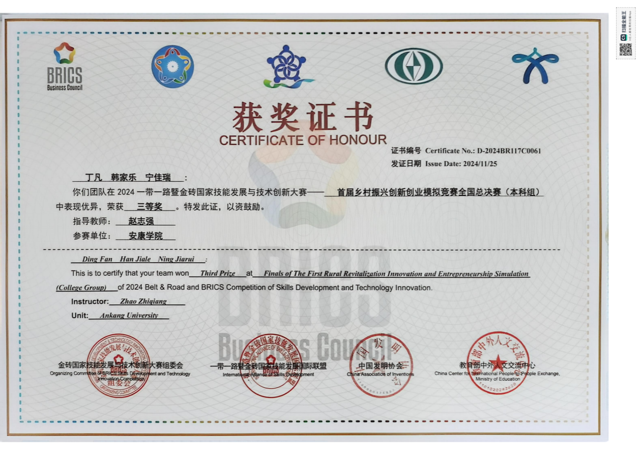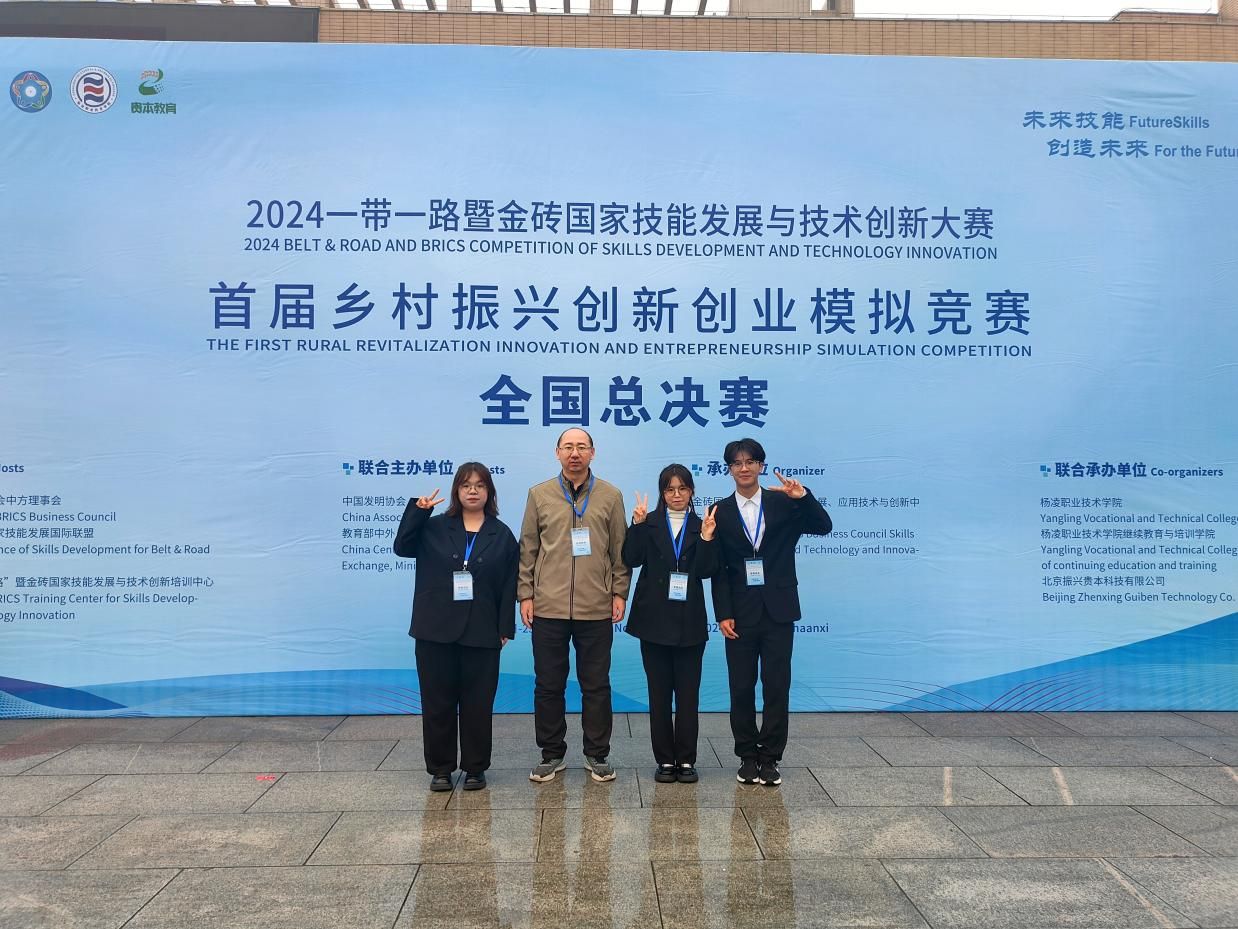 11月23日至25日,2024一带一路暨金砖国家技能发展与技术创新大赛首届乡村振兴创新创业模拟竞赛全国总决赛在杨凌职业技术学院举行,总决赛有来自全国26个省市经过校赛和东部、中部、西部大区赛层层选拔的195支队伍参加,经过激烈角逐,买球体育官方网站2023级电子商务专业学生丁凡、宁佳瑞和经管学院2023级工程管理韩家乐团队荣获三等奖。