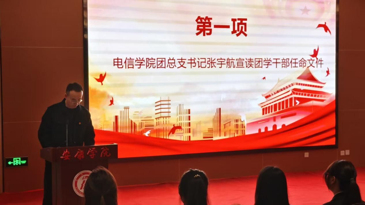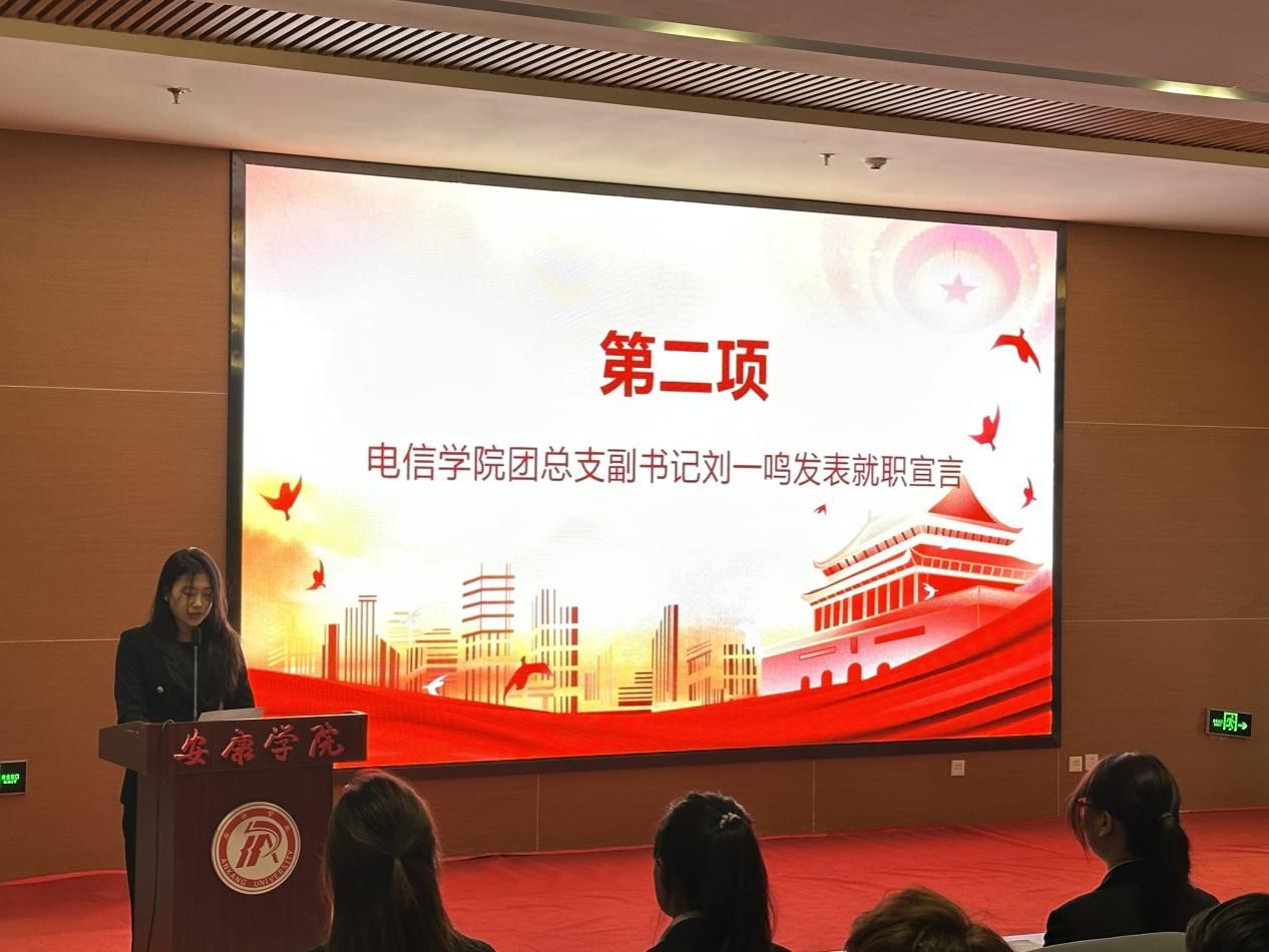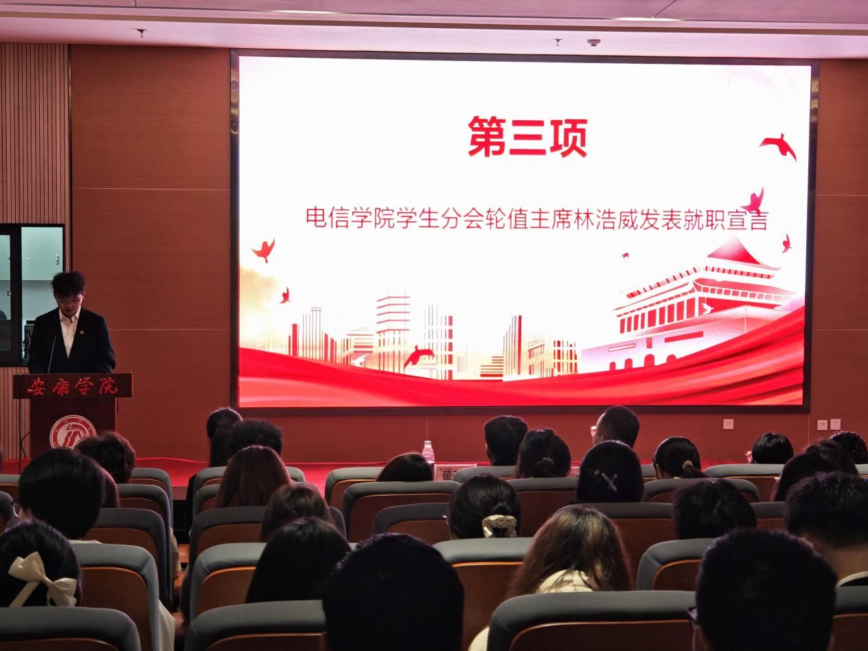 随后,大会进入第38届团总支、学生会成立环节。张宇航宣读了学生组织任命文件,明确了新一届学生组织各部门负责人的任职名单。紧接着,团总支副书记刘一鸣、学生分会轮值主席林浩威、社团服务中心负责人李思宇分别代表新一届学生干部发表就职宣言,他们承诺将以高度的责任感和使命感履职尽责,秉持服务同学、服务学院的宗旨,恪尽职守、锐意进取,推动学院学生工作再上新台阶。