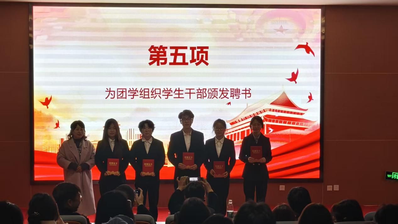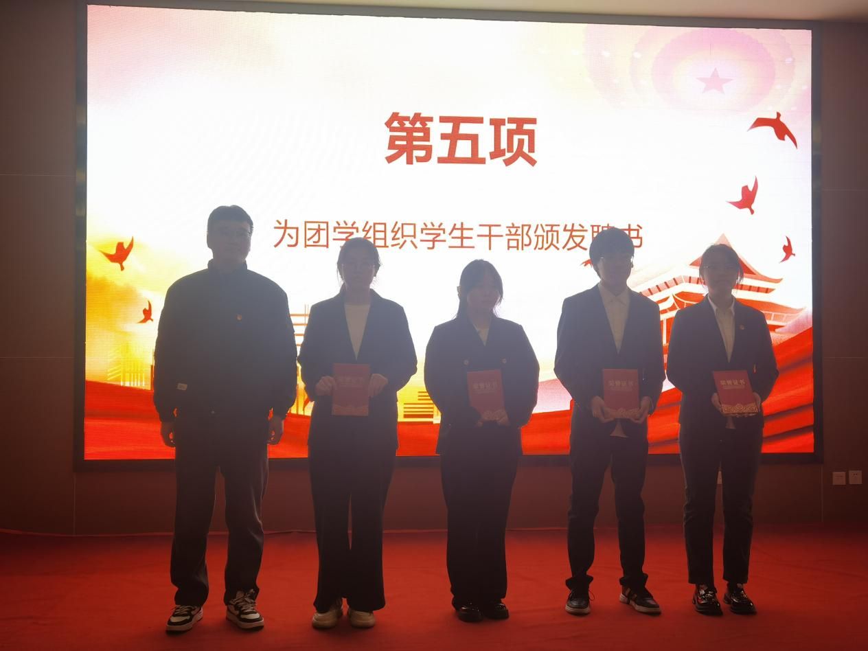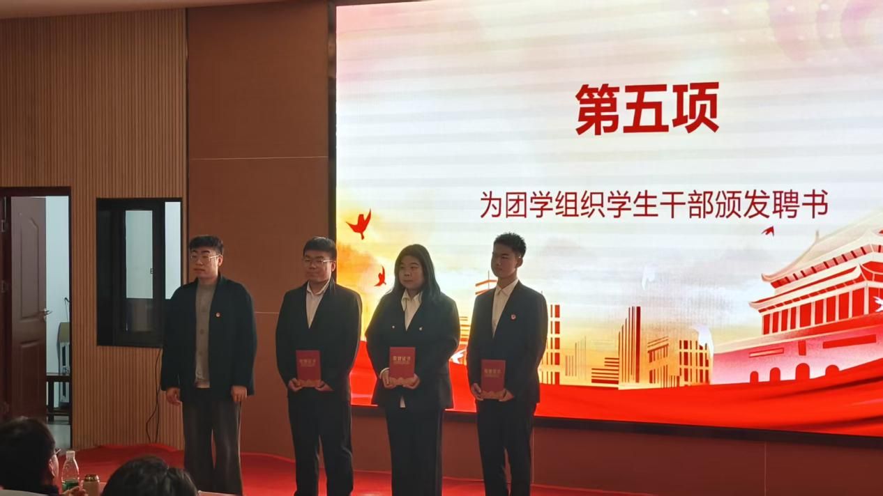 在全场的热烈掌声中,大会迎来了聘书颁发与授牌仪式。田静、成英丽、张宇航、翟子轩、贾金兵分别团学组织干部颁发聘书,一张张崭新的聘书不仅是身份的象征,更是责任的传递,39名团总支干部、31名学生会干部、6名社团服务中心干部接过了服务学院、服务同学的“接力棒”。授牌仪式结束后,学生分会轮值主席孙志豪带领第38届团总支、学生会全体成员庄严宣誓,铿锵有力的誓言彰显了新一届学生干部的担当与决心。