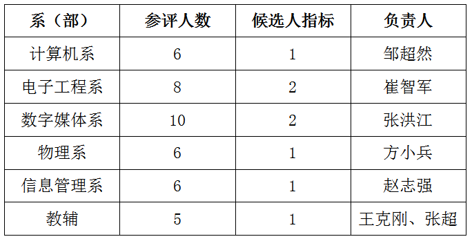 买球体育官方网站各系、部按各自参评人数的20%向学院考核考评工作小组推荐候选人,四舍五入,具体分配名额及负责人见下表。